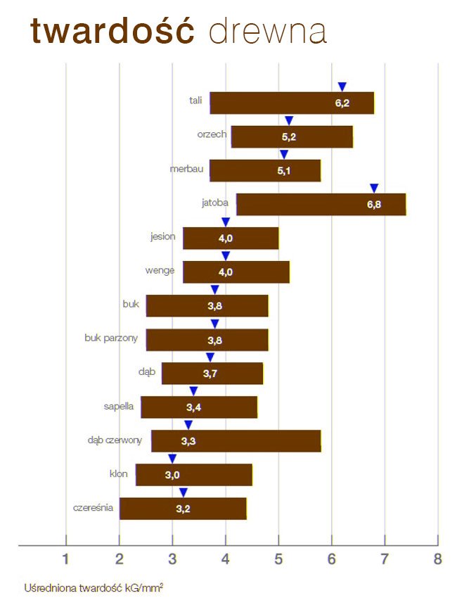Twardość drewna wedłóg skali Brinella wygląda jak na wykresie po prawej.